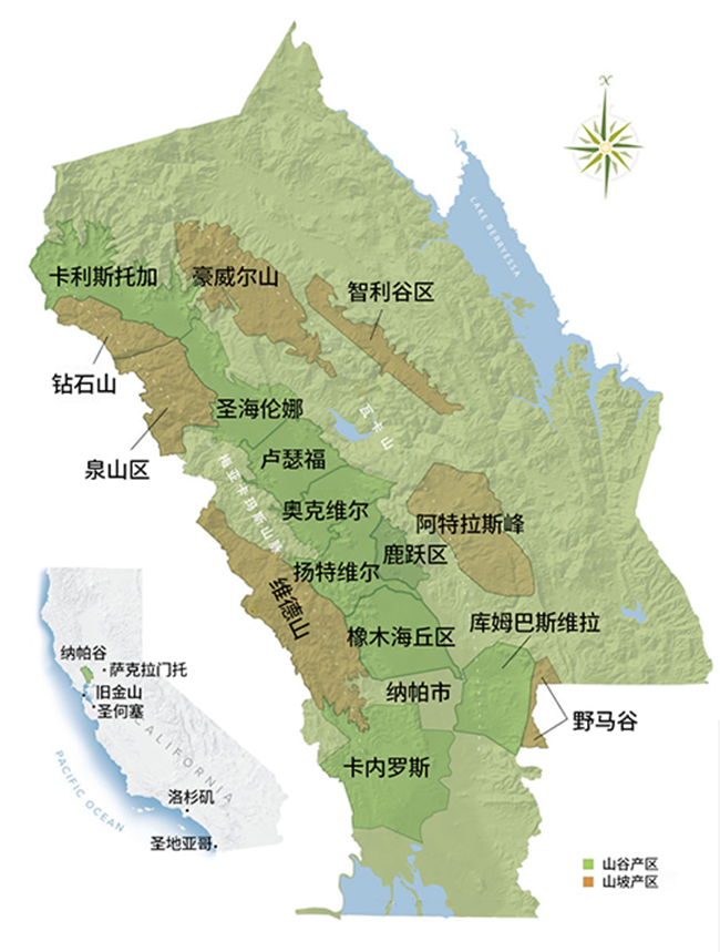 納帕谷坐落在圣帕布魯灣的北側(cè)以及舊金山灣(San Francisco Bay)地區(qū)的東北角,其東側(cè)是瓦卡山(Vaca),跨過(guò)這座山便可到達(dá)中央山谷(Central Valley)的北部,西側(cè)是梅亞卡瑪斯山(Mayacamas),也是納帕谷與索諾瑪縣(Sonoma County)的分界線(xiàn)。納帕谷南北長(zhǎng)約50公里,東西跨度僅有幾公里,雖然面積不大,但這里是美國(guó)第一個(gè)農(nóng)業(yè)保護(hù)區(qū)(Agricultural Preserve),也是加利福尼亞州的第一個(gè)法定種植區(qū)(American Viticultural Area,簡(jiǎn)稱(chēng)AVA)。根據(jù)不同的土壤、氣候和地形,產(chǎn)區(qū)內(nèi)又細(xì)分為十六個(gè)法定種植區(qū)。