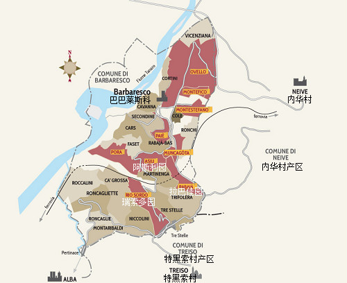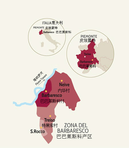 巴巴萊斯科的葡萄園面積僅為巴羅洛的1/3,主要分布在巴巴萊斯科村、內(nèi)華村(Neive)和特黑索村(Treiso)三大著名村莊內(nèi)。因地理位置不同,這些村莊的風(fēng)土條件略有差異:巴巴萊斯科村緊鄰塔納羅河,氣候比較溫和;內(nèi)華村土壤類型多樣,除了鄰近巴巴萊斯科村的葡萄園之外,這里大部分葡萄園的土壤富含沙石;而特黑索村在高海拔和森林的調(diào)節(jié)下,氣候最為涼爽。