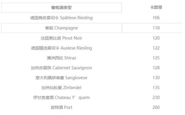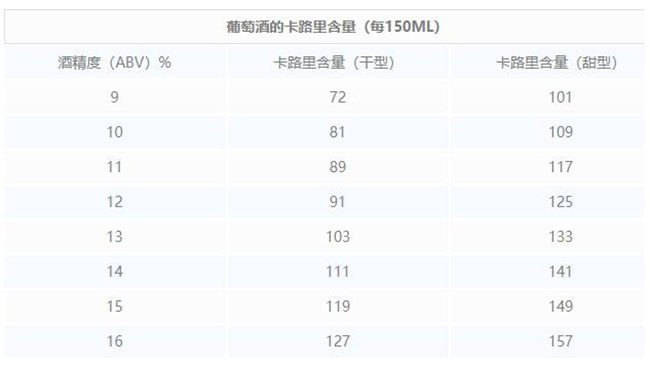 葡萄酒的熱量與其所含的酒精度息息相關(guān)(參考下表),因此不能簡(jiǎn)單地用白葡萄酒、紅葡萄酒來做比較。