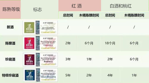 其中,里奧哈葡萄酒又分為Generic(原產(chǎn)地/新酒), Crianza(陳釀), Reserva(珍藏)和Gran Reserva(特級珍藏)。上述四個(gè)等級都是以橡木桶陳釀與瓶陳時(shí)間進(jìn)行的劃分。