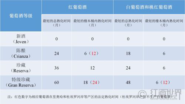 除了跟隨法國(guó)和歐盟的腳步之外,西班牙葡萄酒的分級(jí)也有著自己的特色,那就是對(duì)于DO及以上級(jí)別葡萄酒最短的總熟化時(shí)間和在橡木桶內(nèi)熟化時(shí)間的要求。西班牙根據(jù)熟化時(shí)間將葡萄酒分為4個(gè)等級(jí):新酒(Joven)、陳釀(Crianza)、珍藏(Reserva)和特級(jí)珍藏(Gran Reserva),這幾個(gè)術(shù)語(yǔ)也是我們常在西班牙紅酒的酒標(biāo)上見(jiàn)到的。各級(jí)別對(duì)于熟化時(shí)間的要求見(jiàn)下表: