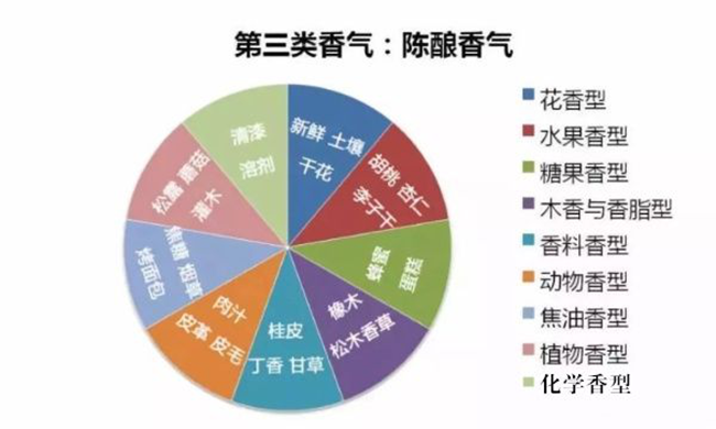 三類香氣是指葡萄酒在陳釀過程中所發(fā)展出來的香氣。當(dāng)葡萄酒被長時(shí)間保存在橡木桶中時(shí),陳釀過程的氧化作用會給葡萄酒增加如咖啡、太妃糖、焦糖等第三類香氣。而當(dāng)葡萄酒被長時(shí)間保存在酒瓶中時(shí),雖說不再有氧化反應(yīng),但也會發(fā)展出如汽油、蜂蜜、蘑菇等第三類香氣。在這個(gè)過程中,葡萄酒中的一、二類香氣會與微量的氧氣接觸發(fā)生氧化反應(yīng),發(fā)展出動物皮革、蘑菇、煙草和森林地表等氣息。而清新的果香也會演化成果醬的味道。這些香氣是一些老年份葡萄酒帶給我們的美好享受。
