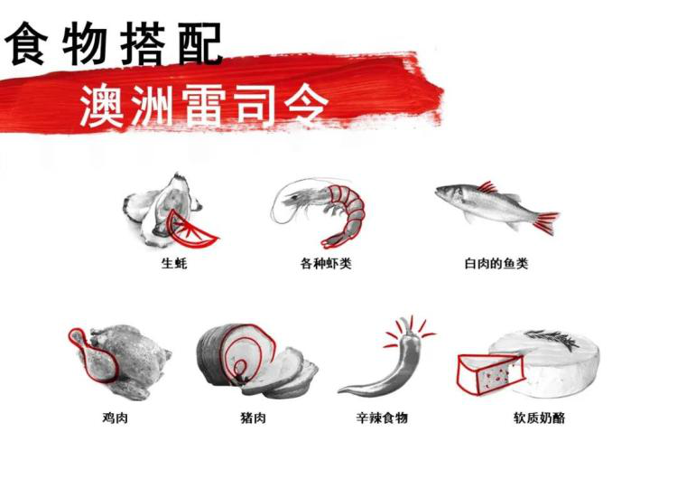 清爽,擁有檸檬-青檸風(fēng)味的干型雷司令:魚,貝類和甲殼類等海產(chǎn)是理想的搭配,特別是佐以檸檬、刺山柑、奶油醬汁或者亞洲調(diào)味汁時。雞肉和豬肉類菜肴能很好的和中度酒體風(fēng)格的雷司令搭配。