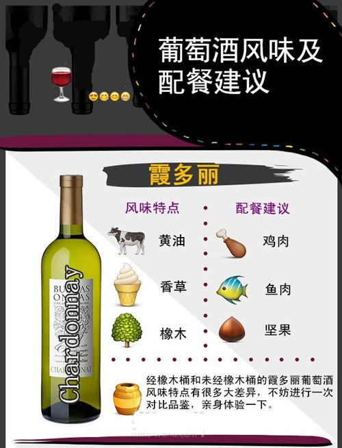 東莞藍(lán)菲城堡葡萄酒代理商用6張圖片列出最主要的6種葡萄酒,并簡要說明相應(yīng)的風(fēng)格特點和配餐建議。比如稱得上“千面女郎”的霞多麗葡萄酒,即可以清新脆爽,也可以豐滿順滑,而決定其風(fēng)格的,除品種本身外,還有釀酒工藝,尤其是橡木桶的使用。【