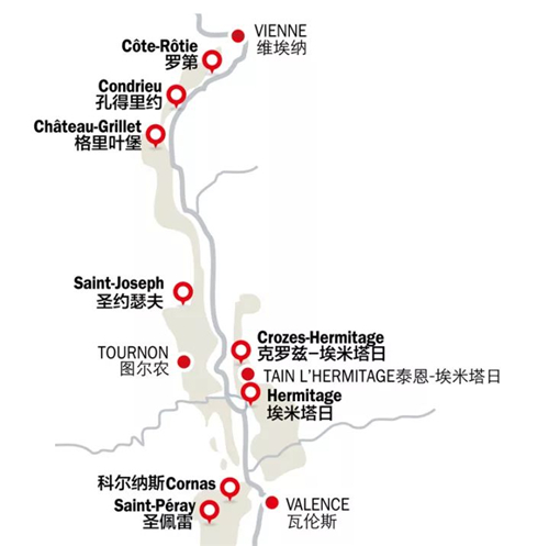 北羅納河谷最有名的產(chǎn)區(qū)當(dāng)屬羅第(Côte-Rôtie)產(chǎn)區(qū)和埃米塔日(Hermitage)產(chǎn)區(qū)。