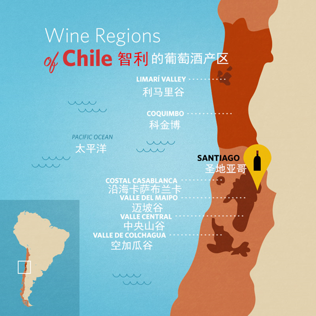 從首都圣地亞哥出發(fā),很快就能到達(dá)智利一些最為著名的葡萄產(chǎn)區(qū)。這些地區(qū)的葡萄種類繁多,既出產(chǎn)單一品種的葡萄酒,也出產(chǎn)混釀葡萄酒。在美國市場上,智利的葡萄酒一直都比較暢銷,其中空加瓜谷、中央山谷(Valle Central)和邁坡谷是智利銷量最大的三個產(chǎn)區(qū)。