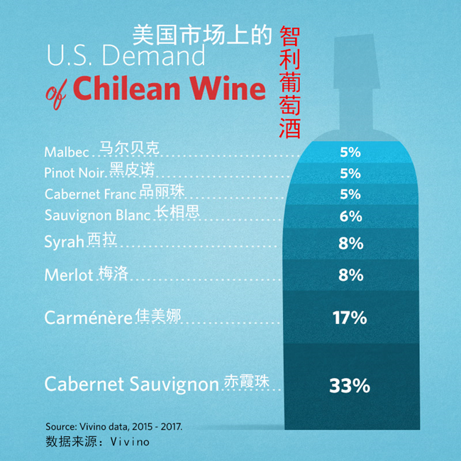 近年來,由于國際需求上漲,智利的葡萄酒行業(yè)發(fā)展勢頭迅猛。雖說現(xiàn)在智利標(biāo)志性的葡萄品種依然是佳美娜,但由于國際上對赤霞珠的需求日益旺盛,在出口到美國的葡萄酒中,采用佳美娜釀造的實(shí)際上只占了17%,而最近頗受歡迎的赤霞珠葡萄酒則占到了總出口量的近三分之一。此外,梅洛和西拉的市場份額占比都略高于8%。