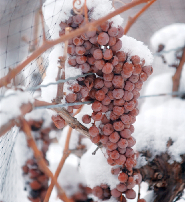 風干葡萄將“濃縮就是精華”奉為真理,冰葡萄則用冰霜鎖住精華。在寒冷地區(qū),種植者們會將葡萄留于枝頭,成串結冰,直至嚴冬在夜間進行采收。冰葡萄硬度大,壓榨時需要施加較大壓力,榨出來的葡萄原汁僅有正常收獲葡萄的五分之一,卻濃縮了很高的糖分、酸度和風味物質。最終的成酒沒有風干葡萄酒那樣不加掩飾的奔放香氣與厚重酒體,而是以清潤甜美的風格自成一派。