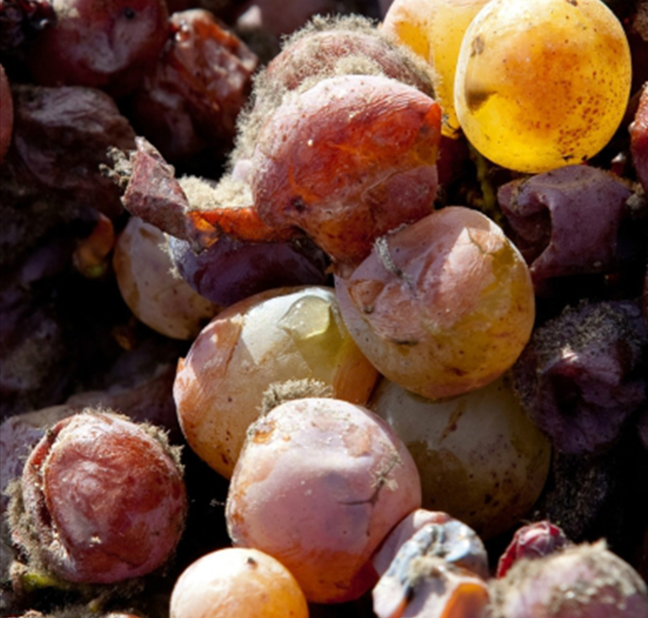 如圖所示,貴腐葡萄身形干癟,表皮還伴有細細的菌絲,若對該類葡萄沒有了解,定會認為這是發(fā)了霉的爛葡萄,但到了葡萄農這兒,它就是彌足珍貴的釀酒原料。要成為貴腐葡萄,被灰葡萄孢菌(Botrytis Cinerea)侵染是第一步,但灰葡萄孢菌“亦正亦邪”,在適當條件下,它可以轉化為有益的貴腐菌(Noble Rot),反之則有可能化身為誘導果實腐爛變質的灰腐菌(Grey Rot)。因此,健康果實感染灰葡萄孢菌的“造化”就全憑清晨是否潮濕多霧、午后是否晴朗干燥來決定了。成功被貴腐菌侵染的葡萄表皮穿孔、水分蒸發(fā),糖分、酸度以及風味物質高度濃縮,與風干葡萄有著異曲同工之妙,卻比風干葡萄產量更低、更加難能可貴。