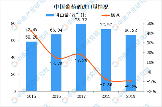 2015-2017年葡萄酒進口量穩步上漲,但是增速放緩。此后兩年葡萄酒進口量持續下降,2019年葡萄酒進口量跌至2016年水平,進口量66.23萬千升,同比減少9.2%。