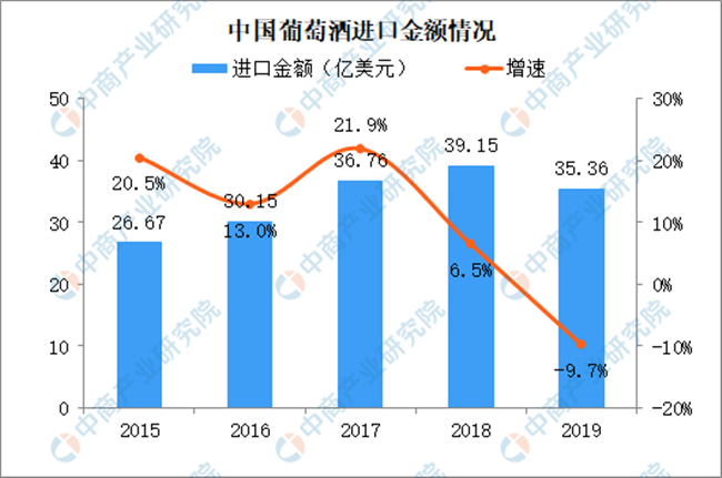 2015-2019年葡萄酒進口金額持續增長,2019年葡萄酒進口金額逼近40億美元。2019年葡萄酒進口金額小幅下跌,進口金額35.36億美元,同比減少9.7%。
