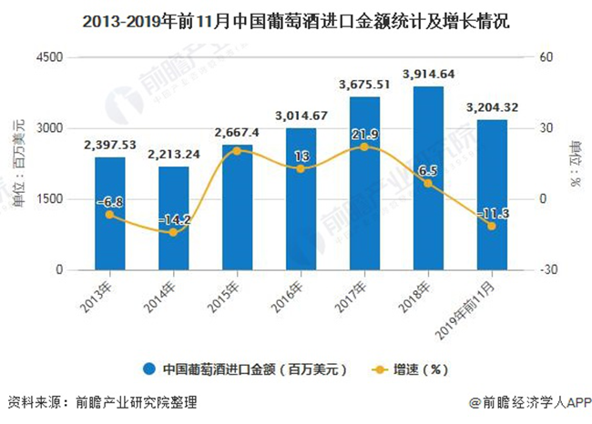 據中國海關總署數據顯示,2019年11月中國葡萄酒進口量為53218千升,同比下降-4.7%。累計方面,2019年1-11月中國葡萄酒進口量達到599355千升,同比下降10.6%。