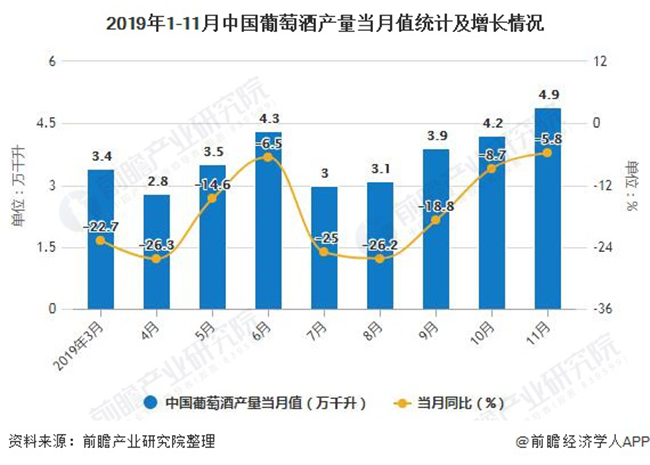 根據國家統計局數據顯示,2018年全年中國葡萄酒產量達到了62.9萬千升,累計下降7.4%。截止至2019年11月中國葡萄酒產量為4.9萬千升,同比下降5.8%。累計方面,2019年1-11月中國葡萄酒產量達到37.2萬千升,累計下降12.1%。