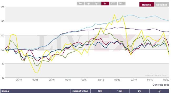 不論短期和長期(5年),行業基準的Liv-ex 100指數和最廣泛市場指標的Liv-ex 1000指數的表現均優于全球股票(和石油!)。 在過去五年,Liv-ex 1000指數已上升了40%,而FTSE100指數卻下跌了5%。