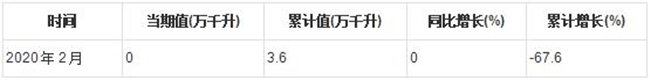 2020年1-02月全國葡萄酒產(chǎn)量累計(jì)值為3.6萬千升,累計(jì)下降67.6%。