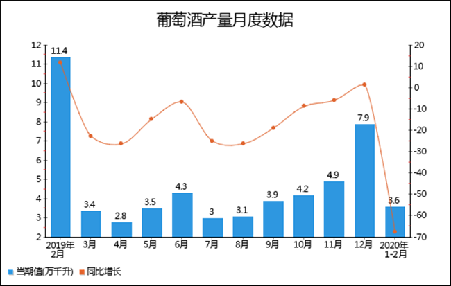 2020年1-2月全國葡萄酒產(chǎn)量分月數(shù)據(jù)