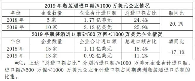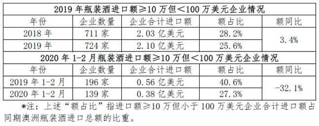 今年1-2月,盡管疫情對行業(yè)有一定沖擊,但澳洲瓶裝酒進口頭部企業(yè)基本穩(wěn)住陣腳。雖然進口額≥1000萬美元的企業(yè)僅1家,少于去年同期,但其進口額同比增長近30%;而進口額≥500萬但小于1000萬美元的企業(yè)有2家,數(shù)量增加,其中,1家進口額實現(xiàn)倍數(shù)增長,1家為新的行業(yè)進入者。