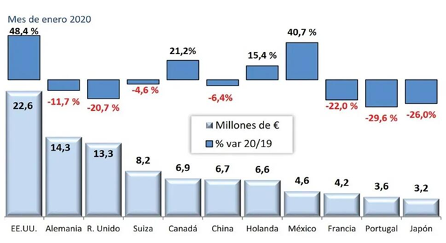 根據(jù)西班牙葡萄酒市場觀察(OeMV)提供的數(shù)據(jù),在2020年的第一個月,西班牙葡萄酒出口的平均銷售價格上漲7.5%,達到1.26歐/升,這使得銷售額的下降幅度低于出口量(銷售額下降1.3%,出口量下降8.1%)。