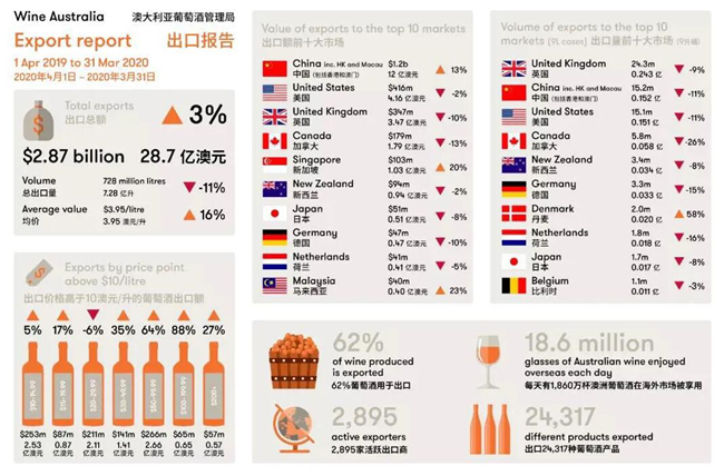 關于3月份的統計數字,澳大利亞葡萄酒管理局統計數字顯示,出口額相比上年同期降低了43%。今年1~3月份澳洲酒對華出口額也降低了14%,下降幅度明顯,而這主要是因為疫情所導致。即使這樣,如果算上2019年的后三個季度,澳洲酒在中國仍然強勢增長,可見2019年奠定的優(yōu)勢有多大!