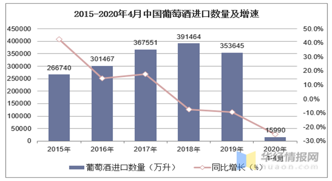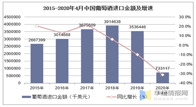 華經產業研究院數據顯示:2020年1-4月中國葡萄酒進口數量為15990萬升,相比上年同期減少了90513.6萬升,降幅為25.3%;進口金額為733117千美元,相比上年同期減少了331919千美元,降幅為31.1%;2020年1-4月中國葡萄酒進口均價為45.85千美元/萬升。