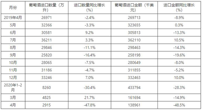 2020年4月中國葡萄酒進口數量為2915萬升,同比下降47.8%;進口金額為138961千美元,同比下降48.5%。