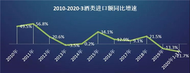 過(guò)去十年,每年的酒類進(jìn)口總額除了2013年這一年有微幅下降以外,其他的年份總體都屬于增長(zhǎng)的狀態(tài)。但2019年卻有了一個(gè)明顯的下降。而2020年,受疫情影響,前三個(gè)月甚至出現(xiàn)了負(fù)增長(zhǎng),幅度為21.7%。就此來(lái)看,2020年形勢(shì)不容樂(lè)觀。