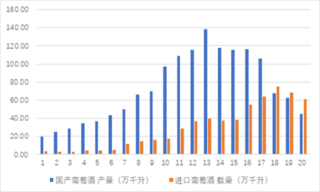 假如時光倒流20年,葡萄酒在中國也是稀罕物,是高端人士過上時尚生活的標(biāo)志,雖然規(guī)模有限只有23.65萬千升,但國產(chǎn)葡萄酒有20.19萬千升,而進(jìn)口葡萄酒只有3.46萬千升。20年后的今天,中國葡萄酒的市場規(guī)模達(dá)到92.1萬千升,國產(chǎn)葡萄酒產(chǎn)量為45.1萬千升,而進(jìn)口葡萄酒的已經(jīng)達(dá)到61.25萬千升。專業(yè)人士稱,這已經(jīng)是進(jìn)口葡萄酒連續(xù)三年超過國產(chǎn)葡萄酒了。