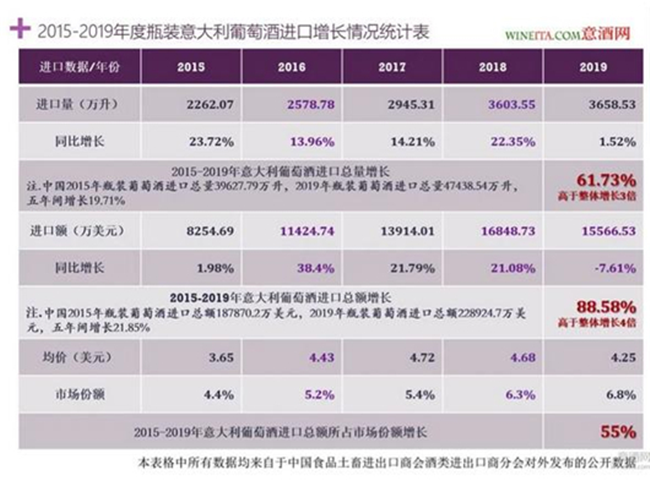 “與美國(guó)、加拿大等成熟市場(chǎng)相比,中國(guó)為代表新興市場(chǎng)的數(shù)據(jù)變化更能說(shuō)明意大利葡萄酒逆勢(shì)上揚(yáng)的現(xiàn)象,”意酒網(wǎng)負(fù)責(zé)人宮照馥分析稱,“從近幾年的數(shù)據(jù)來(lái)看,2015-2018年,中國(guó)市場(chǎng)瓶裝意大利葡萄酒進(jìn)口總額連續(xù)四年增長(zhǎng),只有2019年度相比2018年度下降7.61%。五年間,瓶裝意大利葡萄酒進(jìn)口總額從2015年的8254.9萬(wàn)美元,增長(zhǎng)至2019年的1.5566億美元,五年間增長(zhǎng)88.58%,進(jìn)口額增長(zhǎng)率是同期中國(guó)市場(chǎng)瓶裝葡萄酒進(jìn)口總額增長(zhǎng)率的4倍。而從市場(chǎng)份額角度衡量,2015-2019年,中國(guó)市場(chǎng)瓶裝意大利葡萄酒進(jìn)口額所占市場(chǎng)份額,實(shí)現(xiàn)連續(xù)五年增長(zhǎng),從2015年的4.4%的市場(chǎng)份額,增長(zhǎng)至2019年的6.8%的市場(chǎng)份額。我的預(yù)測(cè)是,按照現(xiàn)有的五年市場(chǎng)份額增速55%,意大利的市場(chǎng)份額將增加到10.54%。”