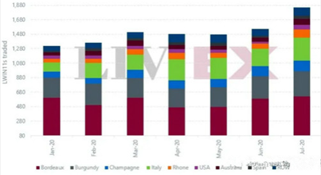 2020年上半年交易的獨立葡萄酒數量比2019年同期增長了37%。下半年初更加強勁,7月份交易的獨立葡萄酒數量(LWIN7)更首次突破1,000;并比之前最高月份高出超過20%(如下所示)。