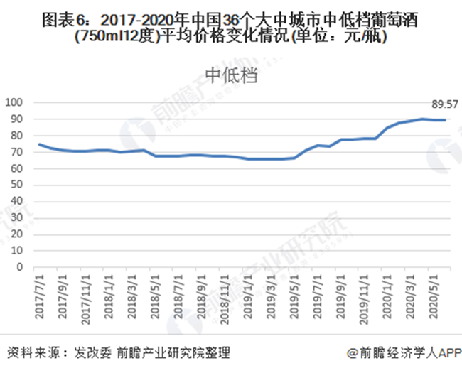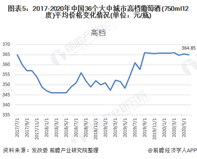 根據(jù)發(fā)改委披露的2017-2020年中國(guó)36個(gè)大中城市日用工業(yè)消費(fèi)品平均價(jià)格來(lái)看,2017-2020年我國(guó)葡萄酒價(jià)格整體上呈現(xiàn)先下降后增長(zhǎng)的態(tài)勢(shì)。其中高檔葡萄酒價(jià)格波動(dòng)幅度略高于中低檔葡萄酒。截至2020年6月,我國(guó)高檔葡萄酒平均價(jià)格為364.85元/瓶,中低檔葡萄酒平均價(jià)格為89.75元/瓶。