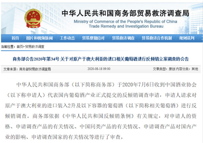 中華人民共和國商務(wù)部(以下簡稱商務(wù)部)于2020年7月6日收到中國酒業(yè)協(xié)會(以下稱申請人)代表國內(nèi)葡萄酒產(chǎn)業(yè)正式提交的反傾銷調(diào)查申請,申請人請求對原產(chǎn)于澳大利亞的進口裝入2升及以下容器的葡萄酒(以下簡稱相關(guān)葡萄酒)進行反傾銷調(diào)查。