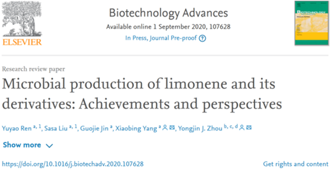 近日,葡萄酒學(xué)院楊曉兵副教授團(tuán)隊(duì)在著名生物技術(shù)學(xué)術(shù)期刊《Biotechnology Advances》(IF=10.744)發(fā)表了題為 “Microbial production of limonene and its derivatives: Achievements and perspectives” 的綜述文章,系統(tǒng)總結(jié)了近年來利用代謝工程和合成生物學(xué)策略合成檸檬烯及其衍生物研究進(jìn)展。西北農(nóng)林科技大學(xué)為第一署名單位,中科院大連化學(xué)物理研究所為合作單位;16級(jí)本科生任毓瑤和18級(jí)博士研究生劉灑灑為共同第一作者,我校楊曉兵副教授與大連化物所周雍進(jìn)研究員為共同通訊作者,我校靳國(guó)杰副教授參與了該綜述的撰寫工作。《Biotechnology Advances》是生物技術(shù)領(lǐng)域頂級(jí)國(guó)際期刊,在105種應(yīng)用微生物與生物技術(shù)相關(guān)的雜志中排名第3,該雜志全年收錄文章在100篇左右,2019年H指數(shù)161。