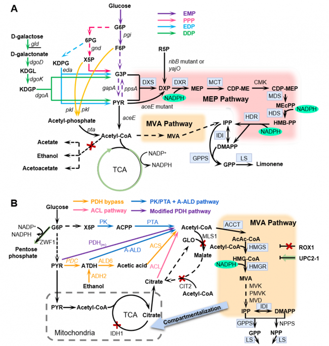 楊曉兵副教授團(tuán)隊(duì)長(zhǎng)期致力于利用代謝工程和合成生物學(xué)策略構(gòu)建高價(jià)值化合物細(xì)胞工廠的研究工作。目前,已利用代謝工程策略成功改造圓紅冬孢酵母(Rhodosporidium toruloides)構(gòu)建了檸檬烯等單帖化合物、羥基化脂肪酸、氨基酸衍生物的細(xì)胞工廠,其中檸檬烯微生物合成相關(guān)研究工作獲得陜西省面上基金(2020JM177)、學(xué)校科研啟動(dòng)基金、國(guó)家級(jí)科創(chuàng)等支持,指導(dǎo)2016本科生任毓瑤畢業(yè)論文獲得校級(jí)畢業(yè)論文。該綜述介紹了微生物合成檸檬烯及其衍生物面臨的機(jī)遇與挑戰(zhàn),詳細(xì)闡述了異戊二烯途徑多樣性、代謝路徑關(guān)鍵酶的發(fā)掘與表征、宿主細(xì)胞代謝路徑的理性調(diào)控、輔因子平衡、檸檬烯及其衍生物生物毒性的解除及提升宿主微生物魯棒性的策略等內(nèi)容。本綜述詳盡討論了大腸桿菌、釀酒酵母、藍(lán)細(xì)菌和產(chǎn)油酵母等生產(chǎn)平臺(tái)菌株的優(yōu)勢(shì)與不足,為系統(tǒng)地理性改造微生物代謝網(wǎng)絡(luò)構(gòu)建單帖細(xì)胞工廠提供了科學(xué)參考。