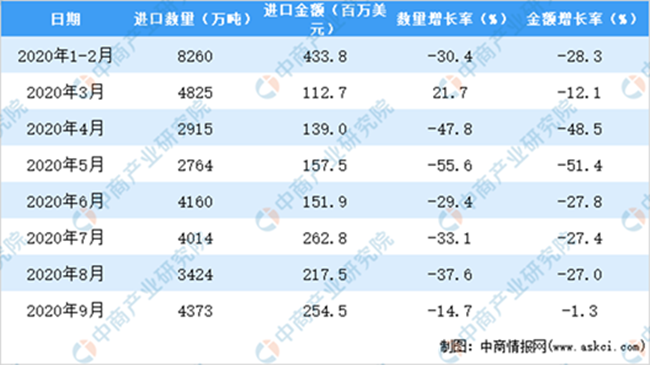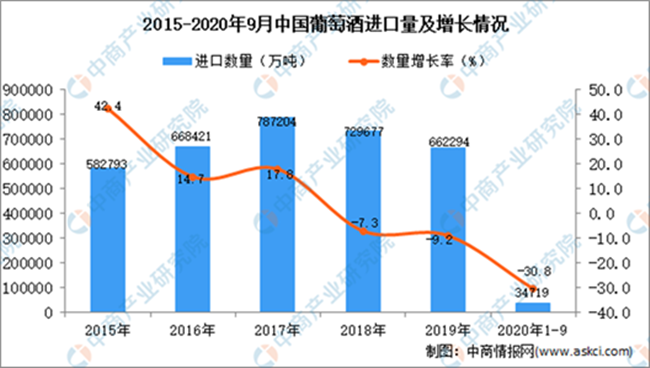 數(shù)2020年1-9月中國葡萄酒進(jìn)口量及金額增長(zhǎng)情況
