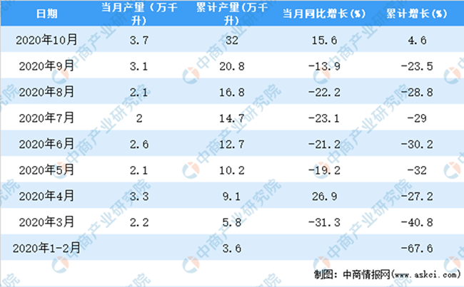 據(jù)中商產(chǎn)業(yè)研究院數(shù)據(jù)庫顯示,2020年10月全國葡萄酒產(chǎn)量增長,2020年10月全國葡萄酒產(chǎn)量為3.7萬千升,同比增長15.6%。2020年1-10月全國葡萄酒產(chǎn)量為32萬千升,同比增長4.6%。
