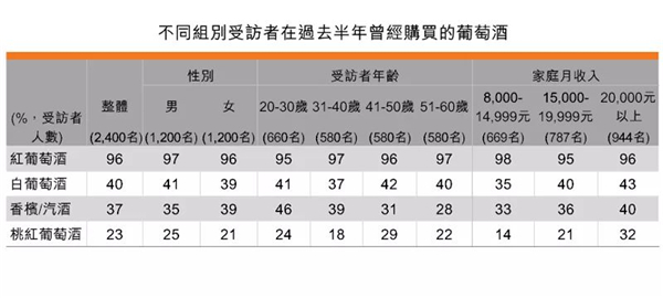 同時,家庭月收入越高,受訪者購買不同類別葡萄酒的比例也越高。例如家庭月收入在20,000元以上的受訪者曾購買白葡萄酒、香檳及起泡酒、桃紅葡萄酒的比例,明顯高于家庭月收入在8,000-14,999元的受訪者。