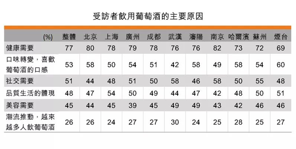根據(jù)調(diào)查顯示結(jié)果,近年來內(nèi)地消費(fèi)者對飲用葡萄酒的態(tài)度觀念有所改變。以往飲用葡萄酒主要是商務(wù)應(yīng)酬或社交需要,現(xiàn)在則有77%表的受訪者表示飲用葡萄酒的原因是健康需要;53%表示口味轉(zhuǎn)變,喜歡葡萄酒的口感。只有51%受訪者表示飲用葡萄酒是因?yàn)樯缃恍枰?而受潮流影響的則只有26%。