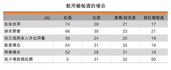 這次調(diào)查把葡萄酒分為四大類別:紅葡萄酒、白葡萄酒、桃紅葡萄酒及香檳及起泡酒。數(shù)據(jù)顯示: