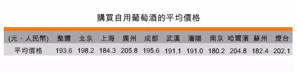 對于購買自用的葡萄酒,受訪者趨向理性消費(fèi)。47%受訪者購買葡萄酒的價格范圍在101-200元之間;整體受訪者平均購買自用的葡萄酒價格約193.6元一瓶。其中,廣州為205.8元、哈爾濱為204.8元,煙臺為202.1元,受訪者平均購買自用葡萄酒的價格較高,超過200元一瓶。