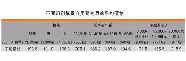 調(diào)查顯示,女受訪者購買自用葡萄酒的平均價格為196.3元,略高于男受訪者的191.0元。20-30歲消費(fèi)者容易接受較高價格的葡萄酒,因?yàn)樗麄冑徺I自用葡萄酒的平均價格為205.1元,相對其他年齡組別高。隨著家庭月收入上升,受訪者購買自用葡萄酒的價格也同時提高。