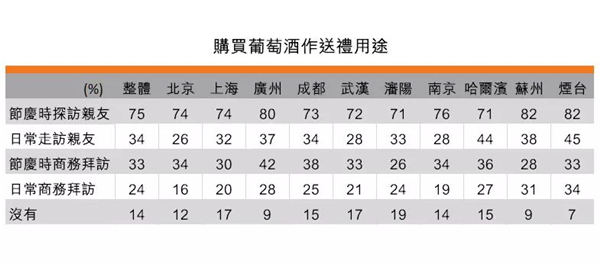 受訪城市中,蘇州及煙臺均有82%、廣州80%的受訪者表示在節(jié)慶探訪親友時曾購買葡萄酒作為送禮用途,高于75%整體平均比例。而煙臺和哈爾濱分別有45%和44%的受訪者在日常走訪親友時購買葡萄酒作為送禮用途,高于34%整體平均比例。