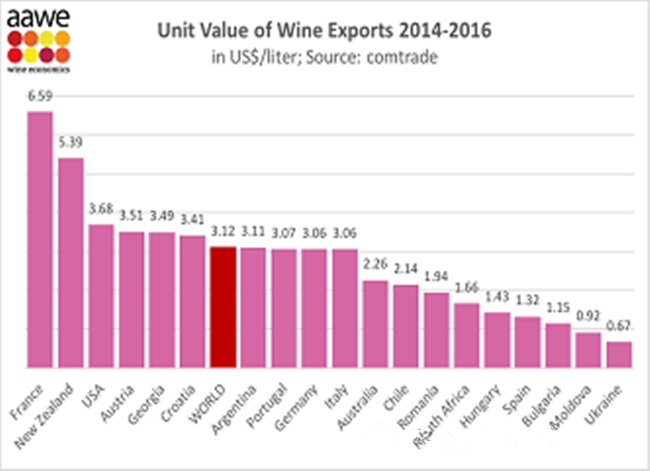 AAWE - 美國葡萄酒經(jīng)濟學(xué)家協(xié)會是一個享有聲望的組織,根據(jù)他們的評級,法國排名第一(6.59美元),其次是新西蘭(5.39美元),美國排名第三(3.68美元)。奧地利領(lǐng)先格魯吉亞,排名第四(3.51美元)。