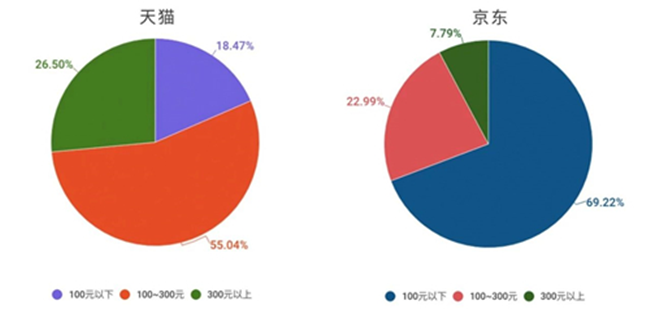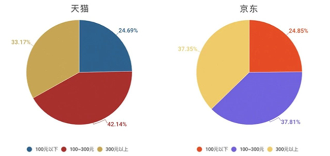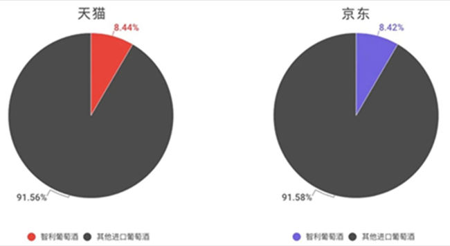 在天貓和京東兩大電商平臺上,智利葡萄酒的酒款數量占比均為8.4%,非常一致;此外,兩大平臺不同價位的智利葡萄酒分布也相對接近──低端智利酒的占比略低,而中高端的酒款數量比起意大利等競爭對手來說則明顯占比更高。