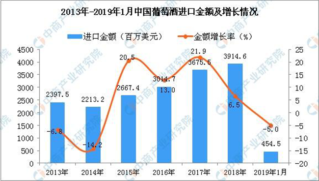 從金額方面來看,2013年-2014年中國葡萄酒進口金額有小幅度下降,2015年-2018年中國葡萄酒進口金額增長;2019年1月中國葡萄酒進口金額為454.5百萬美元,同比下降5%。