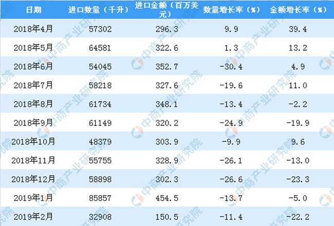 2018年-2019年2月中國葡萄酒進(jìn)口數(shù)量及金額增長率情況