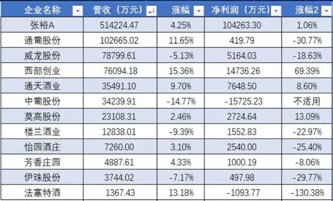 2018年被認為是中國葡萄酒行業(yè)的調(diào)整之年,整個葡萄酒行業(yè)呈現(xiàn)出小幅下滑的局面,據(jù)國家統(tǒng)計局數(shù)據(jù),2018年全國規(guī)模以上葡萄酒企業(yè)總產(chǎn)量62.9萬千升,比2017年下降7.36%;累計實現(xiàn)銷售收入288.51億元,同比下降9.51%;累計實現(xiàn)利潤總額30.63億元,同比下降9.46%。這12家上市企業(yè)發(fā)布的年報數(shù)據(jù),與去年整年的行業(yè)氛圍相符。大概也正是因為去年行業(yè)“看跌”的聲音不絕于耳,提前打了“預防針”,當全年數(shù)據(jù)公布和12家公司年報披露時,行業(yè)沒有表現(xiàn)出很大的落差。