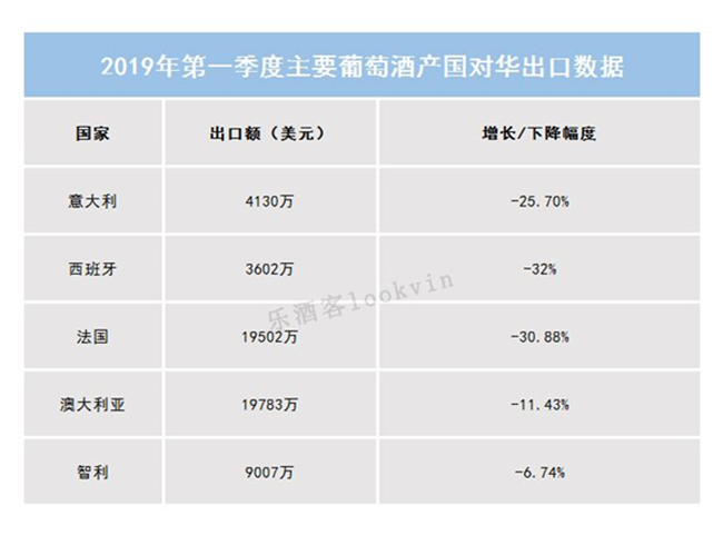 根據(jù)報告,2019年第一季度中國進口葡萄酒進口量為1.56億升,較上年同期下降22.3%;進口額為7.82億美元,較上年同期(9.8億美元)下降20.19%。