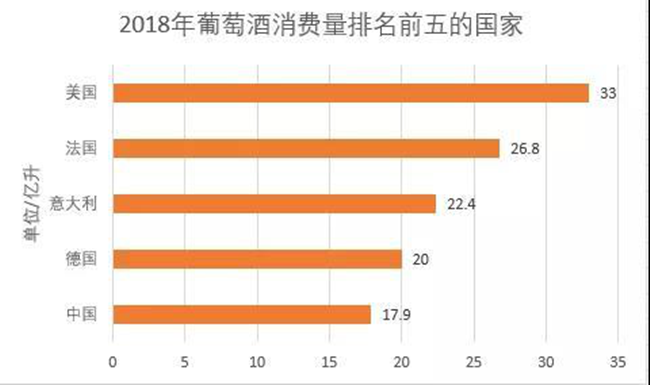2018年葡萄酒進口排名前五的國家分別是德國(14.7億升)、英國(13.2億升)、美國(11.5億升)、法國(7.1億升)和中國(6.9億升),占2018年全球葡萄酒進口量的一半以上。