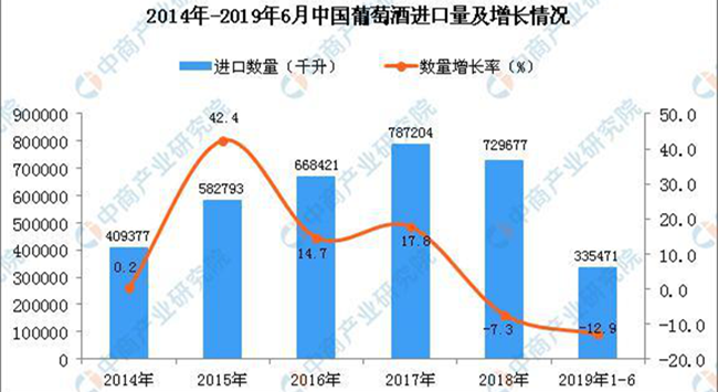 中商情報網(wǎng)訊:據(jù)中商產(chǎn)業(yè)研究院數(shù)據(jù)庫顯示,2019年1-2季度中國葡萄酒進口量逐漸增長,增長11.58%。2019年1-6月中國葡萄酒進口量為335471千升,同比下降12.9%。