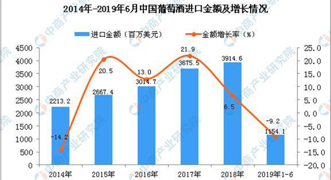 從金額方面來看,2019年1-6月中國葡萄酒進口金額為1154.1百萬美元,同比下降9.2%。